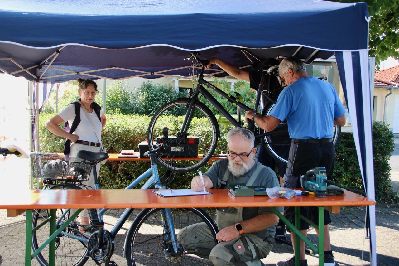 Bei dem sonnigen Wetter kamen auch sechs Drahtesel auf den Fahrradmontageständer. Fünf davon wurden nach der Reparatur verkehrstüchtig entlassen, eines fiel durch. Dem Besitzer wurde geraten, dass Fahrrad zu entsorgen.