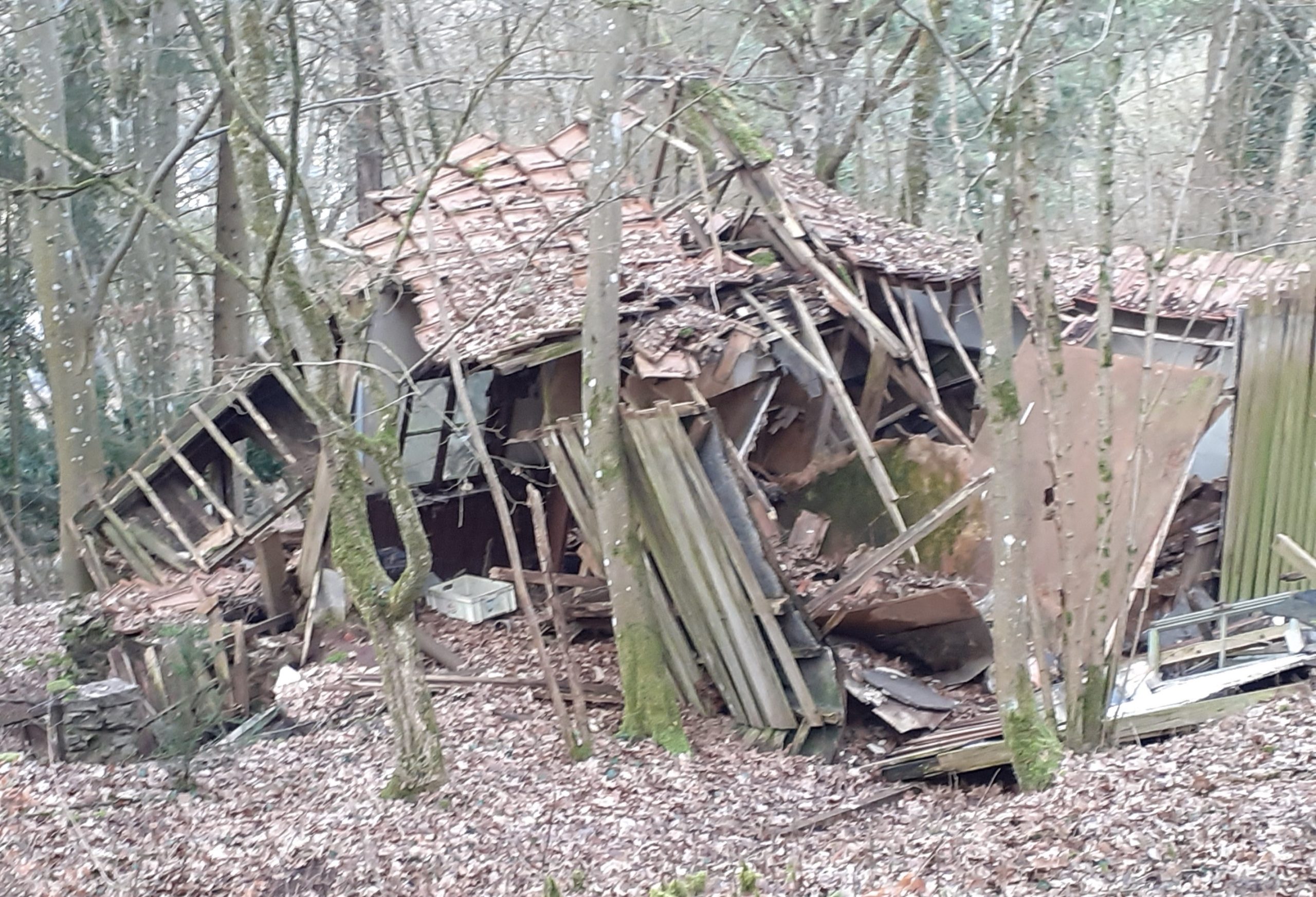 Weiterhin wurde eine eingestürzte Hütte, ebenfalls ein Schwarzbau, gemeldet, die sich etwa in der Höhe des Wendeplatzes der Bachwiese befindet. Diese Hütte liegt gut versteckt in zweiter Reihe am Hang und von der Straße nicht einsehbar.