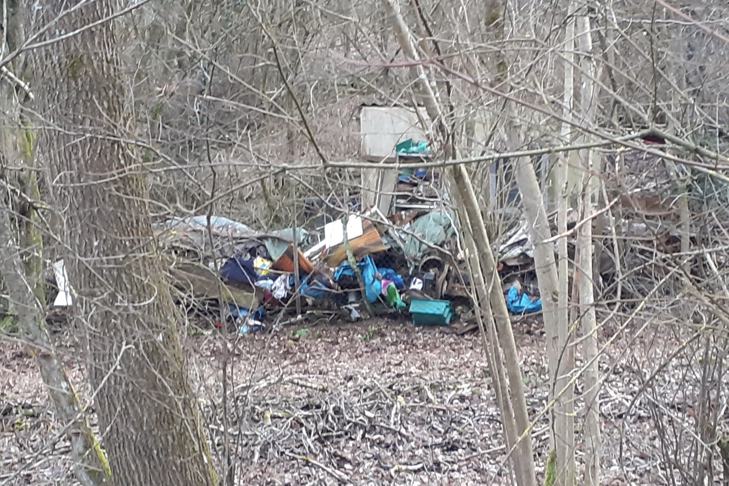 Tatsächlich konnte schon ziemlich am Anfang der Straße eine riesige illegale Abfallentsorgung im Bereich eines Schwarzbaues gefunden werden. Es wurde klar, dass der Müll nicht erst seit gestern dalag. Er ist jetzt durch die kahlen Bäume sichtbar geworden.